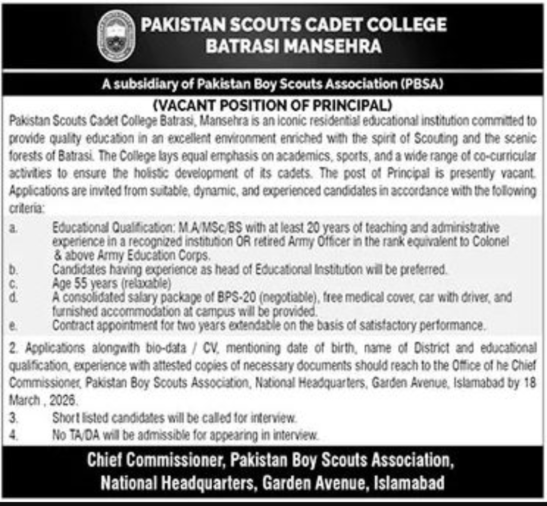 Principal Job At Pakistan Scouts Cadet College
